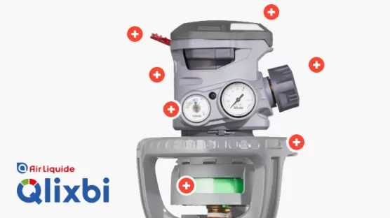 Qlixbi är ett komplett “paket” som i synnerhet gör det enkelt att byta gasflaska. Paketet omfattar en connector och en 33 liters- 300 bar gasflaska.