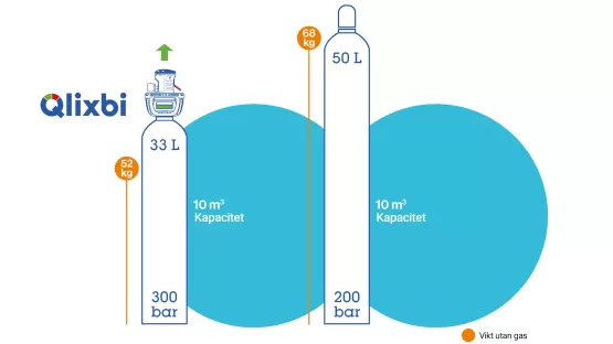Vi rekommenderar definitivt Qlixbi i 33-litersflaskan med 300 bar. Den kompakta flaskan inklusive Qlixbi-connectorn väger endast 52 kg.